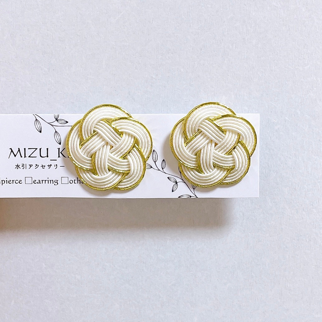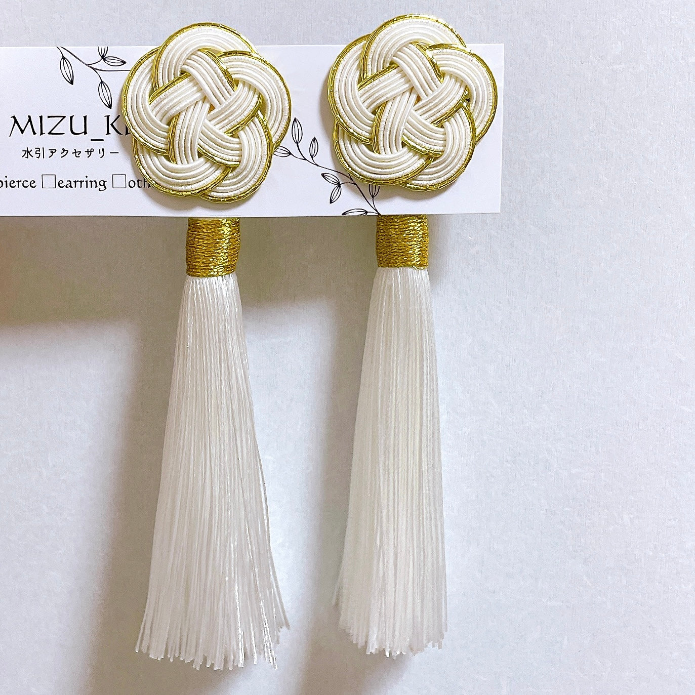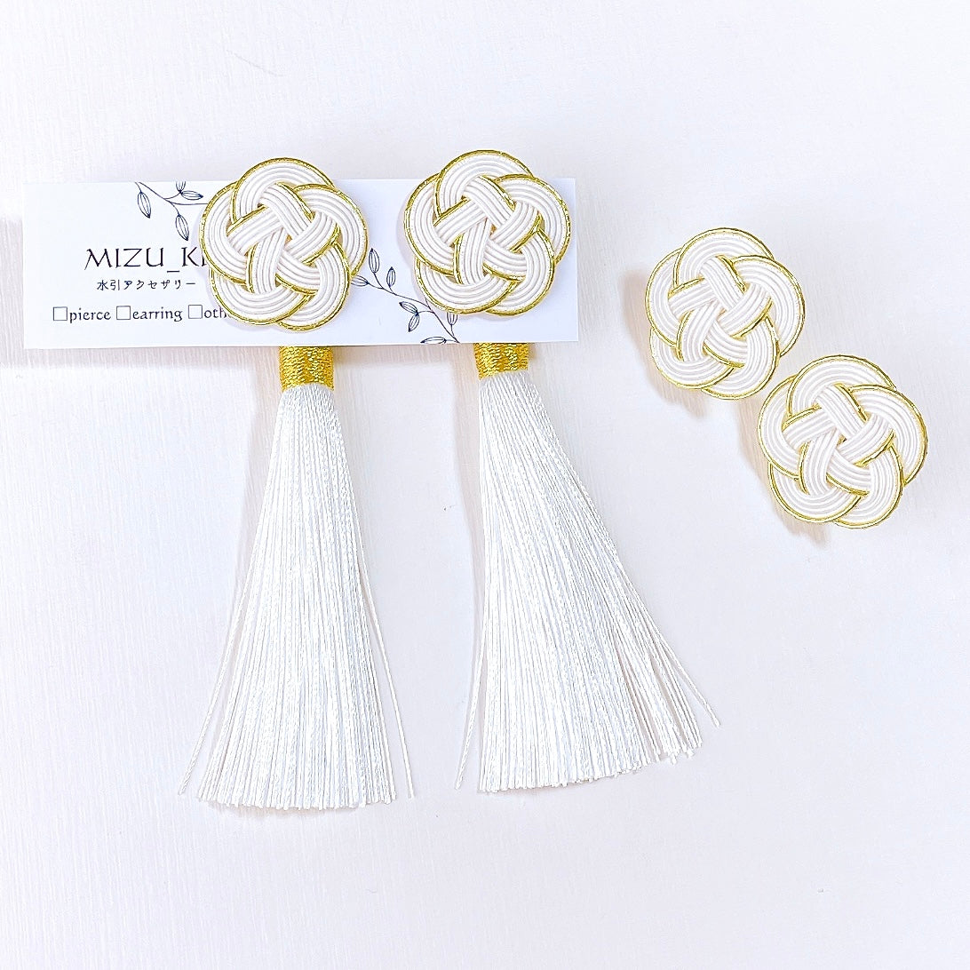 白梅の水引飾りに、さらさらのタッセルがついた耳飾りです。